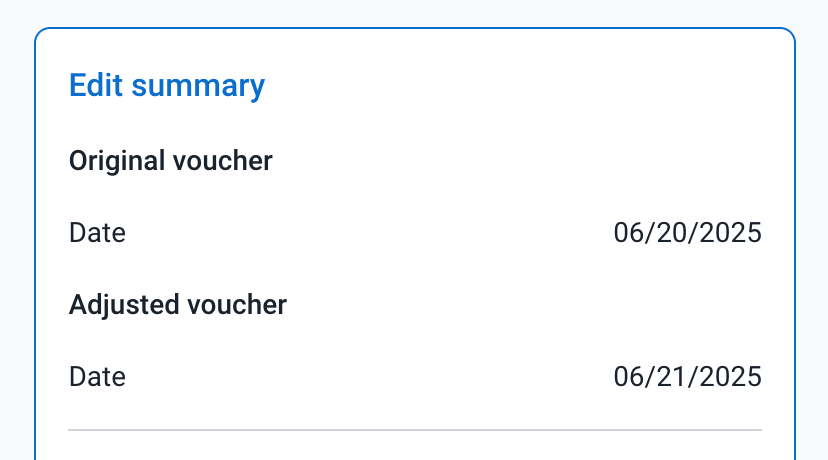 Updates made in the Date section of the voucher page will be reflected in the Edit summary under the Adjusted voucher header.