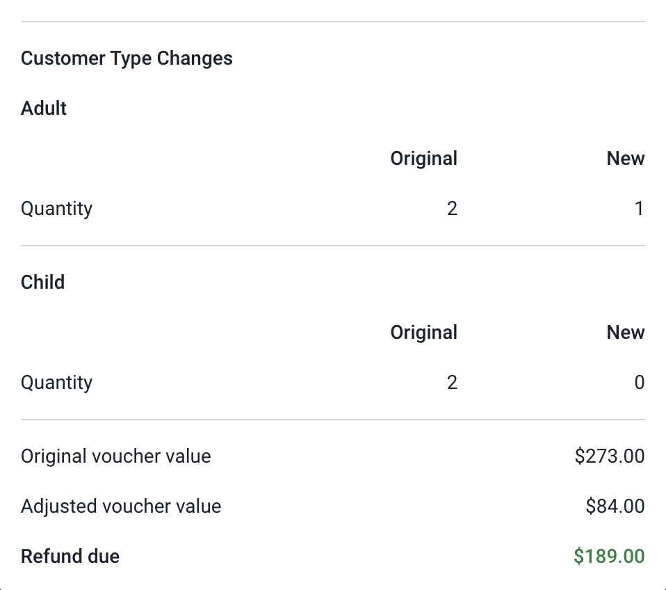 Adjusting values in the Customer types section of the voucher may result in a change in the value of the voucher. This will result in either a payment or credit due. If you are editing an online voucher, the refund or charge will be handled through the typical workflow and the rebooking will be handled via the FareHarbor API. If the rebooking fails, you must contact the vendor to rebook. If you are editing an offline voucher, the rebooking will need to be manually confirmed by the vendor. See the Online and offline vouchers section of this page for more information.