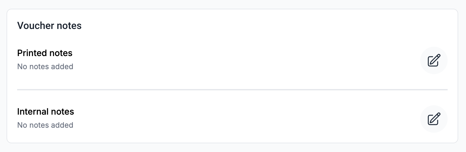 Under the Voucher notes section of the voucher page, you can find Printed notes and Internal notes. Both printed and internal notes can be edited for any voucher status other than Cancelled.