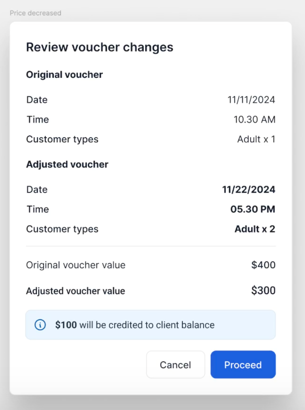 When modifications are made to an existing voucher that alter the value of a voucher, a refund or a charge will be issued to a customer to account for the adjusted price difference. The process for handling these charges or refunds will differ depending on if the voucher is an online or offline voucher.