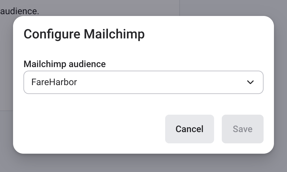After you’ve allowed the integration, you will be taken back to the Integrations section of FareHarbor Desk. To configure your Mailchimp integration, select your desired Mailchimp audience from the dropdown in the modal overlay and click Save.