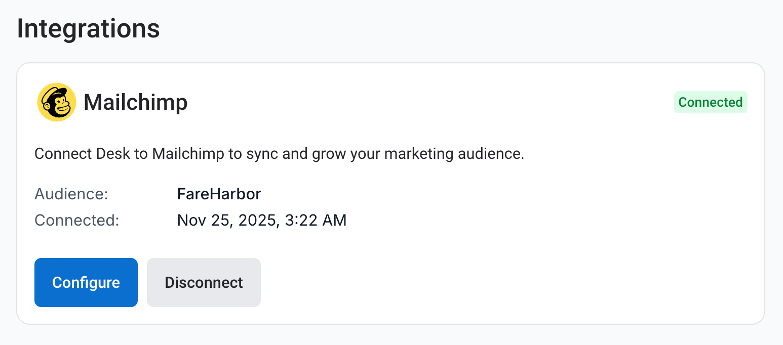 Note: The FareHarbor Desk Mailchimp integration only sends new client data once the integration is configured. Historical data will not be transferred to Mailchimp.