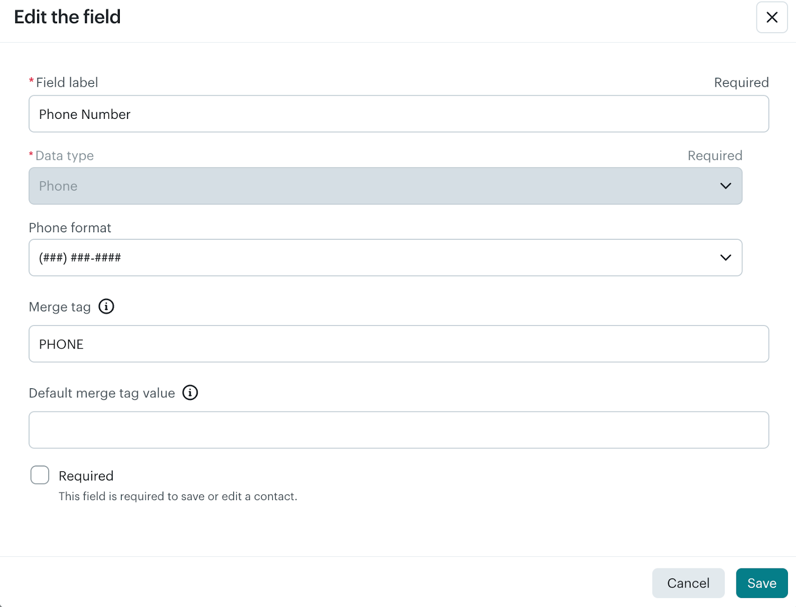 In the settings for your new field, you may create a Field name of your choosing. For data to be mapped properly, you must select the relevant Data type and utilize the exact formatting of each Merge tag.