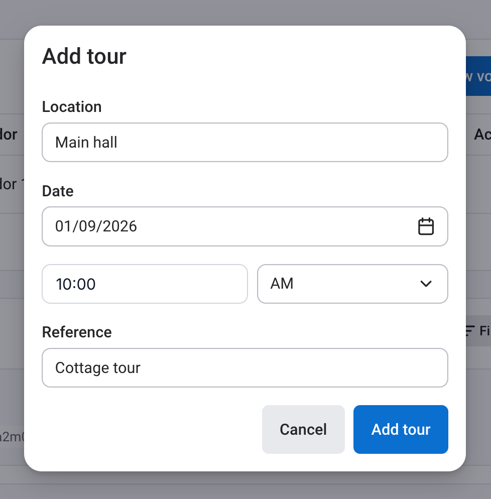 - In the modal overlay for the tour, define the location, date, time, and reference information for the tour: