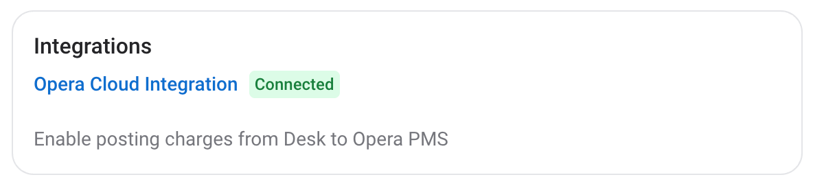 Confirm that your Opera Cloud integration is enabled by navigating to Manage > Desks and editing the desk for which you’ve enabled the integration. At the bottom of the desk’s settings, the Integrations card will display the connection status of the Opera Cloud Integration: