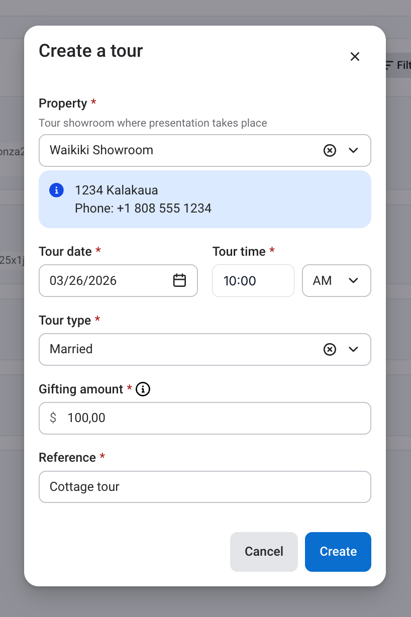 In the Add tour modal, enter the property, date, time, tour type, gifting amount, and reference information for the tour.