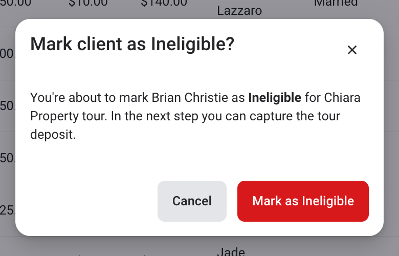 If a customer has been marked as Ineligible, a modal overlay will appear prompting you to confirm that you would like to mark the customer as ineligible. Click Mark as Ineligible: