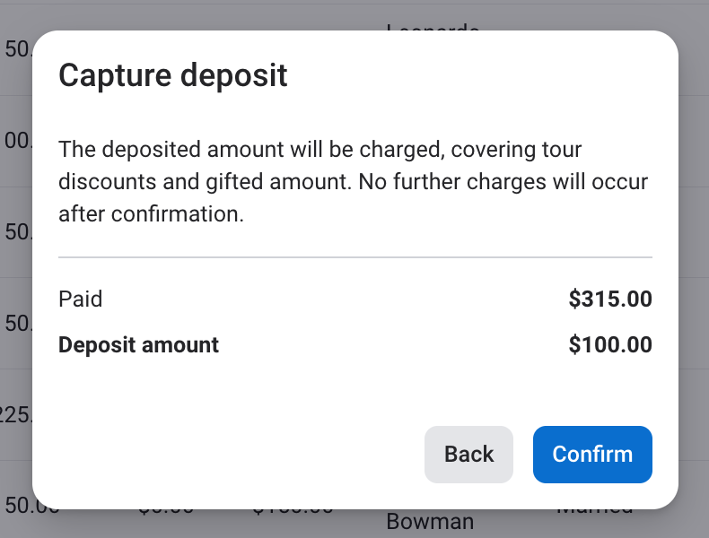 Once marked as ineligible, the Capture deposit overlay will appear. Click Confirm and the deposited amount will be charged, covering tour discounts and the gifted amount.