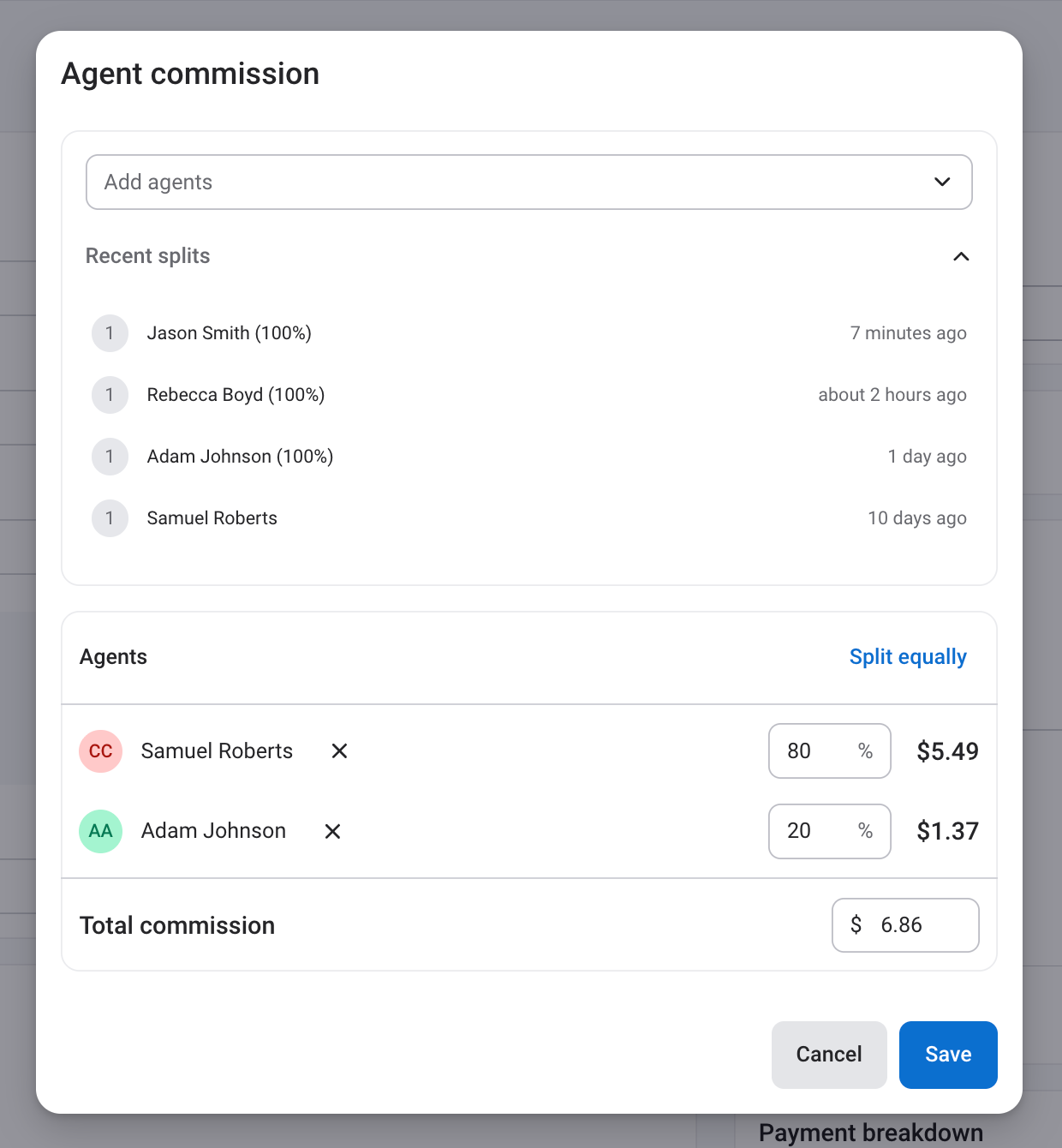 After saving, Desk recalculates the commission allocation and records the split as a recent profile for future use.